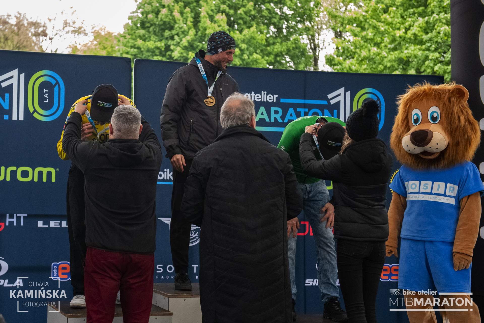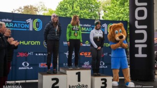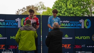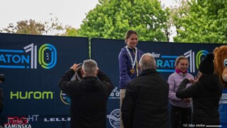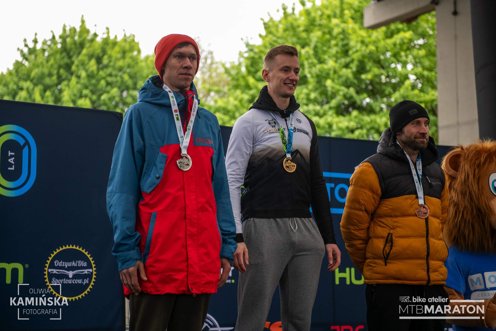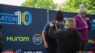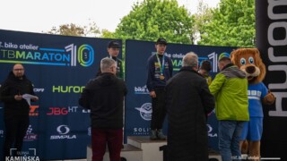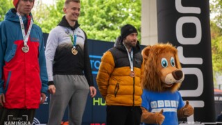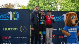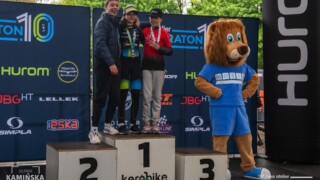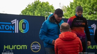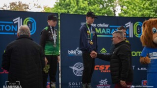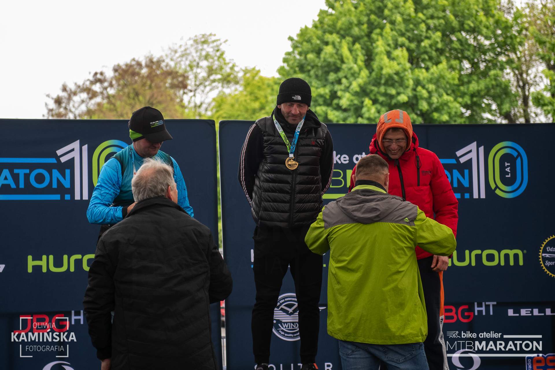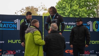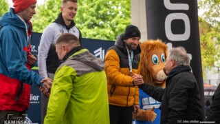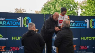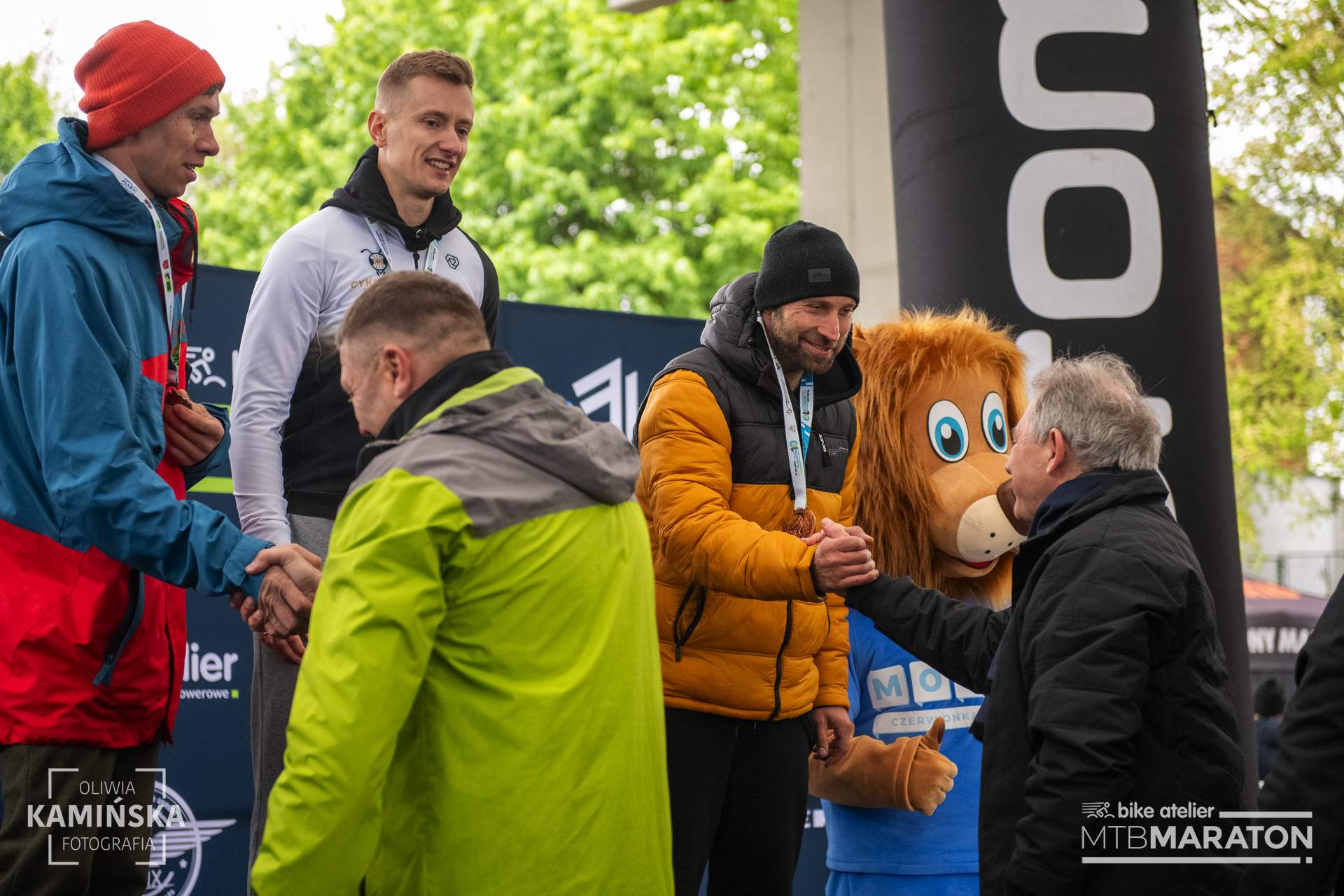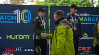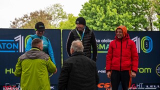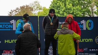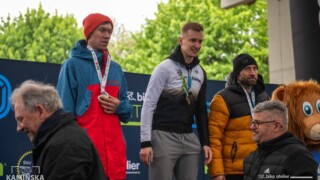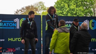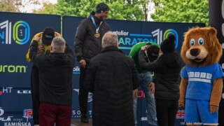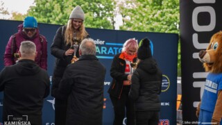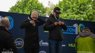 Ceremonie dekoracji najszybszych z najdzielniejszych zawodników, którzy wystartowali mimo surowych warunków na trasie maratonu w Czerwionce-Leszczynach. Foto: Oliwia Kamińska Fotografia
