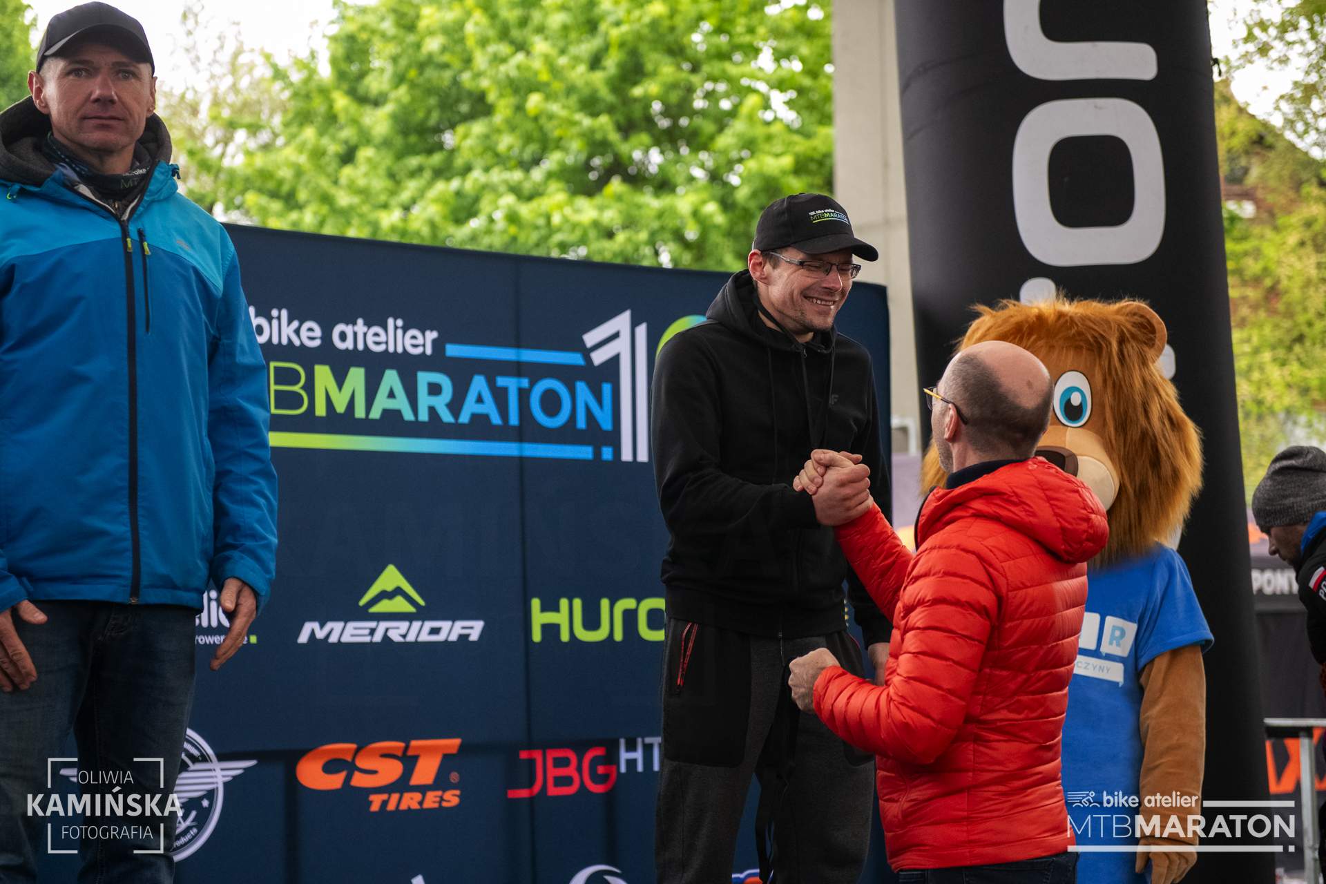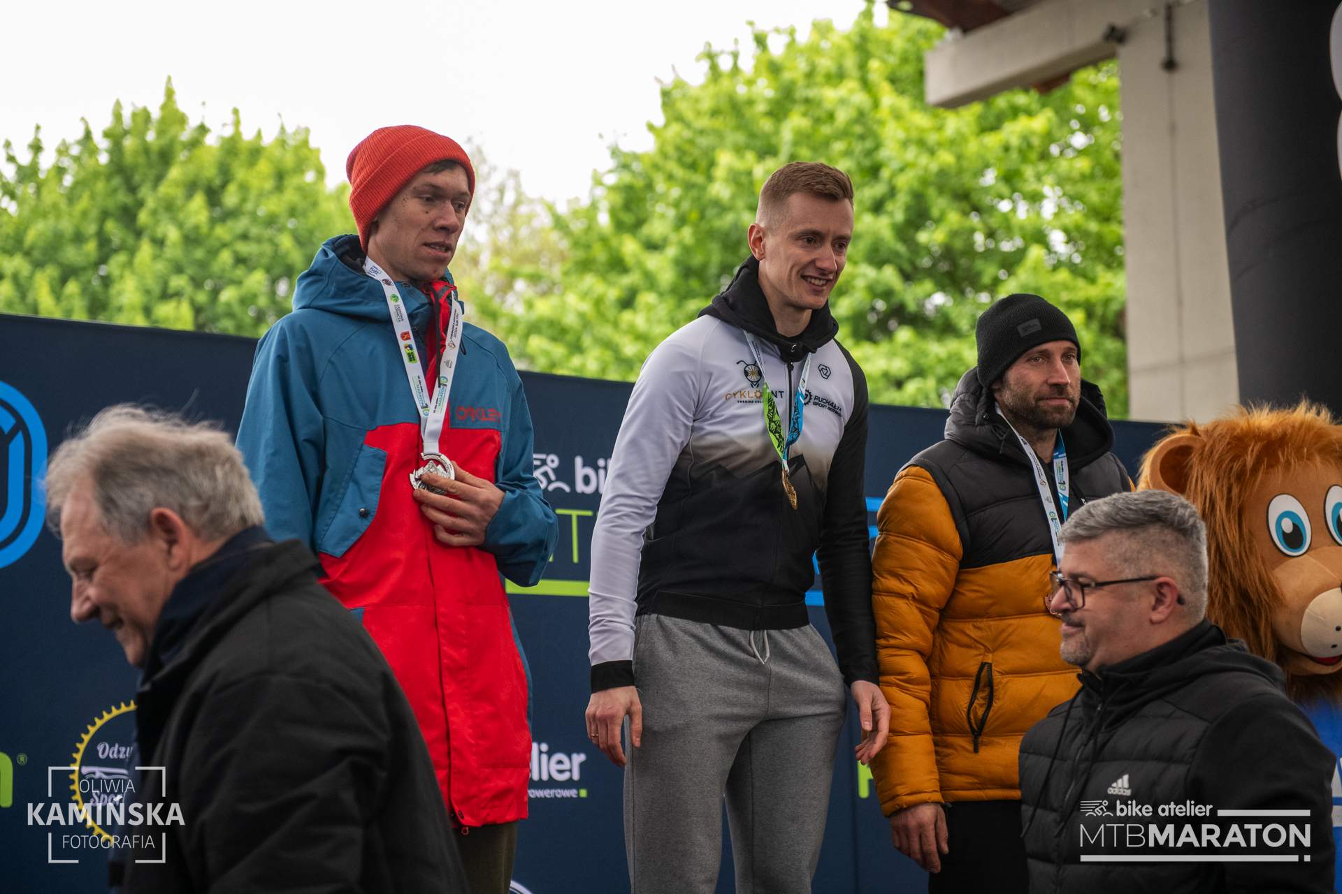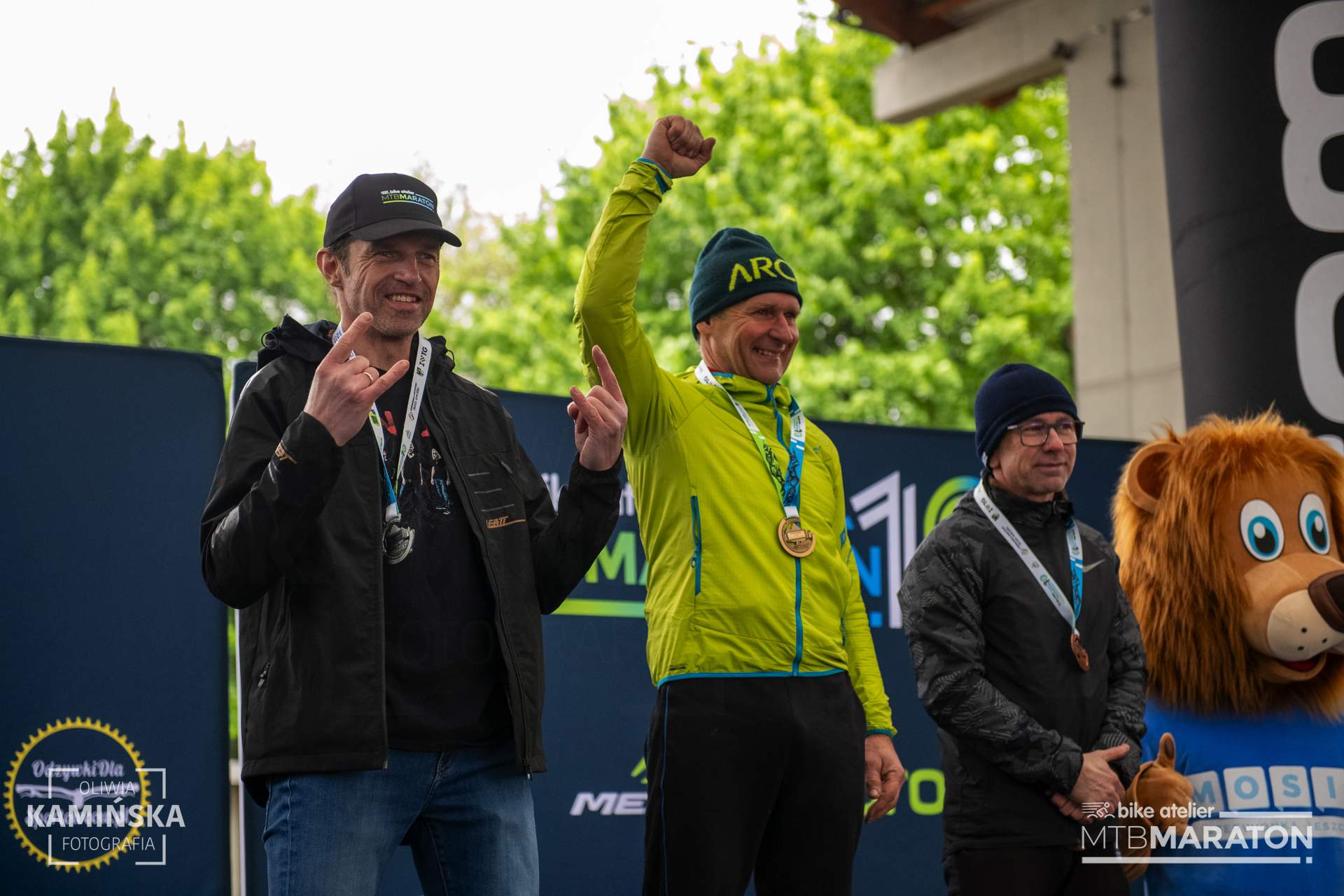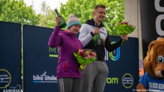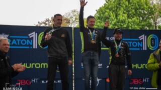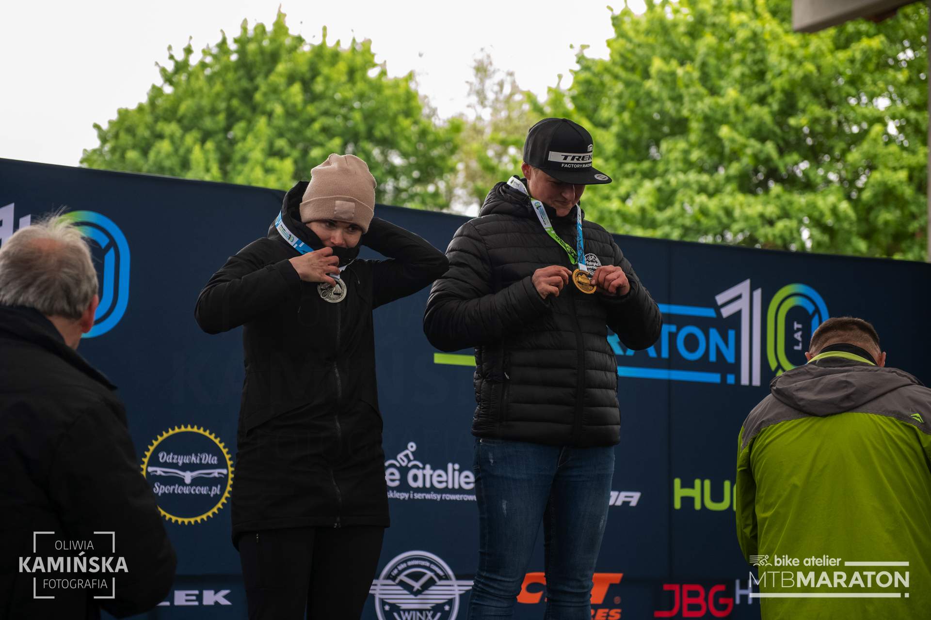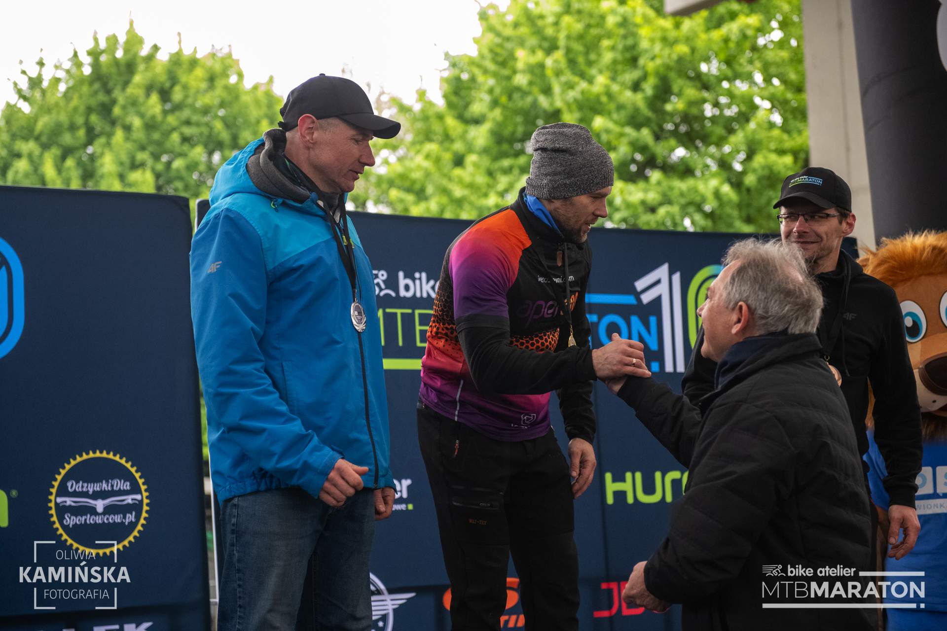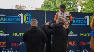 Ceremonie dekoracji najszybszych z najdzielniejszych zawodników, którzy wystartowali mimo surowych warunków na trasie maratonu w Czerwionce-Leszczynach. Foto: Oliwia Kamińska Fotografia